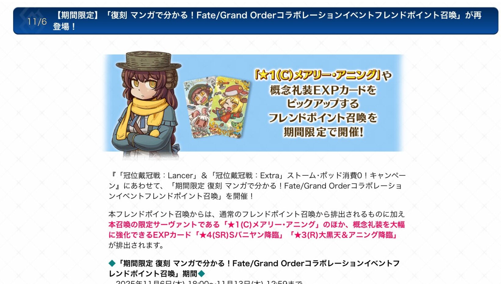経験値礼装がオイシイ、マンガで分かるコラボフレポガチャや、ザビーズが出やすい専用フレポガチャなんてものもありましたが、これら勿論今回復刻