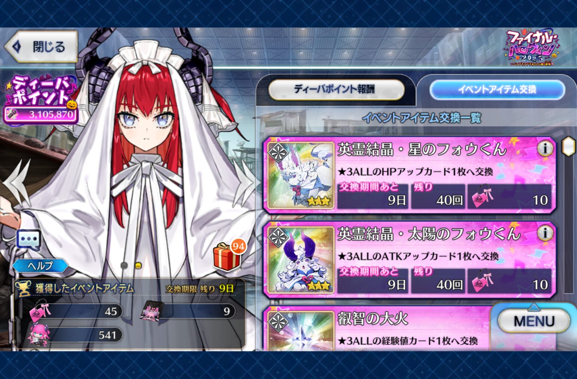 ↑画像の、周回において超絶便利…と思われる終わエリちゃんが入手可能な、2025年ハロウィンイベントは今週水曜日まで