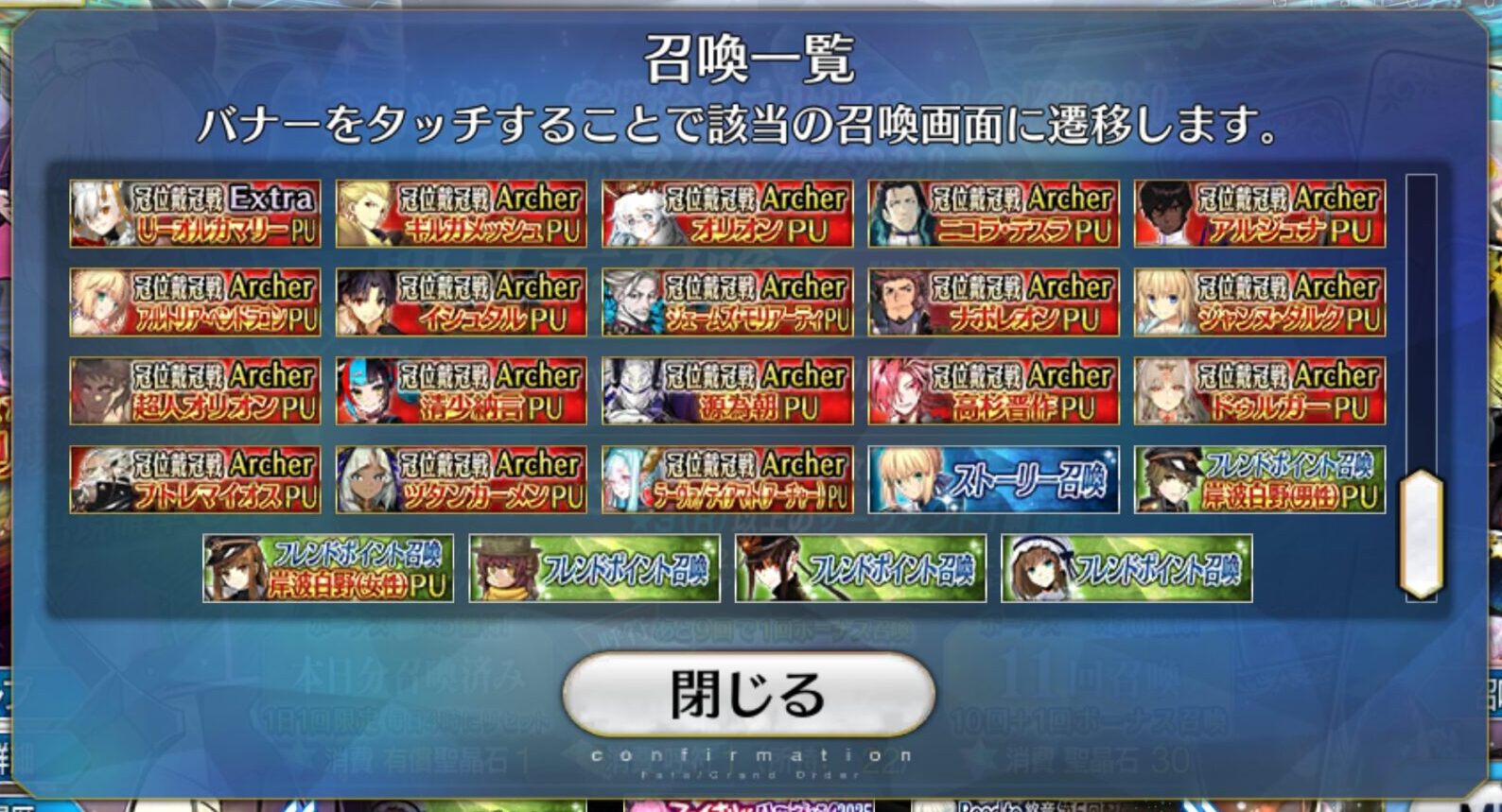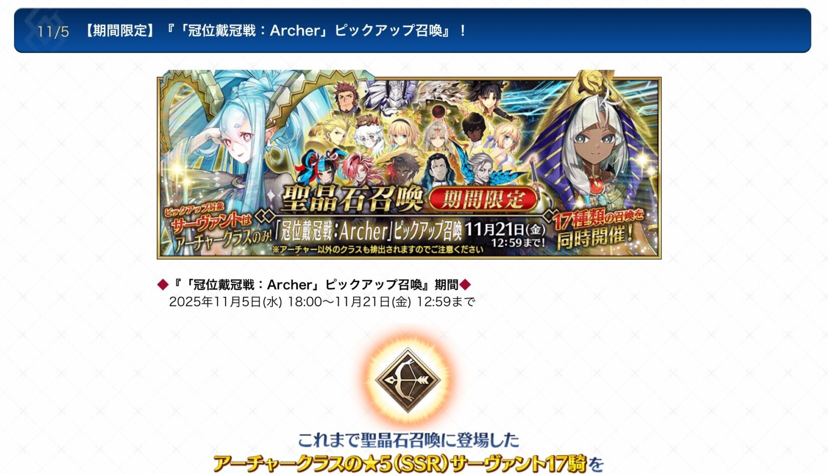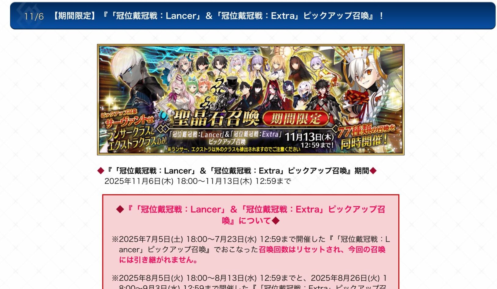 その原因がこちら。復刻版全槍鯖&全EX鯖ピックアップ及び、弓戴冠戦に向けての全弓鯖ピックアップ