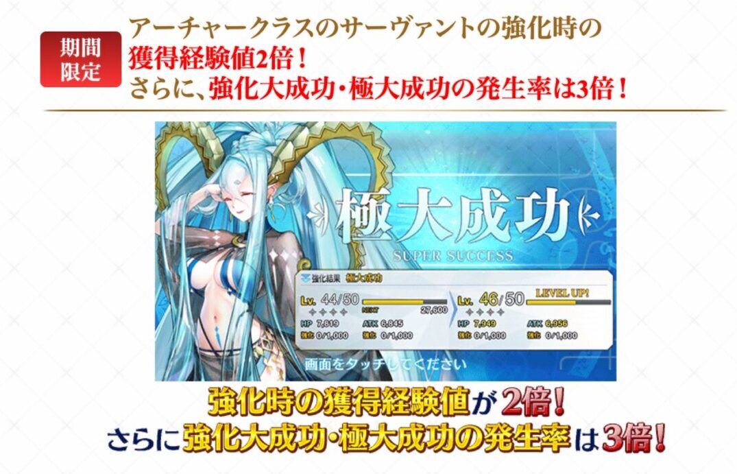 まぁそれはそれとして、弊カルデアのグランドアーチャー…アーチャー?予定鯖のレベル上げをするうぃうぃさん。いつも通り、種火クエ消費半減&獲得経験値量2倍&大成功3倍になっているため、弓冠位鯖のレベル上げするなら今。