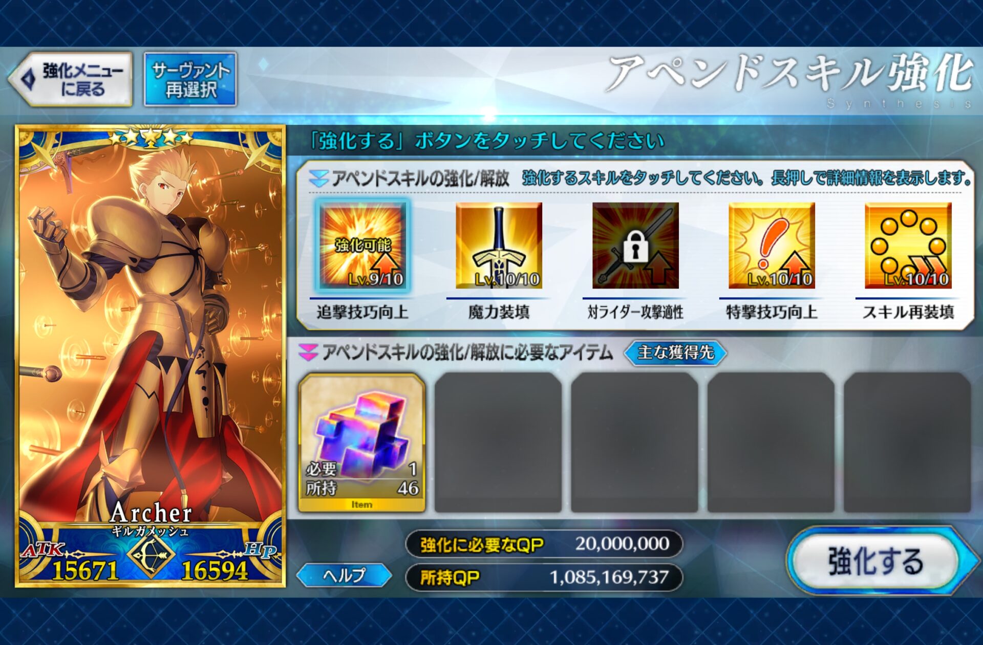 ところでうちの金ピカ王(宝具3&絆12)、レベルはなんとここで打ち止め。なにせ、