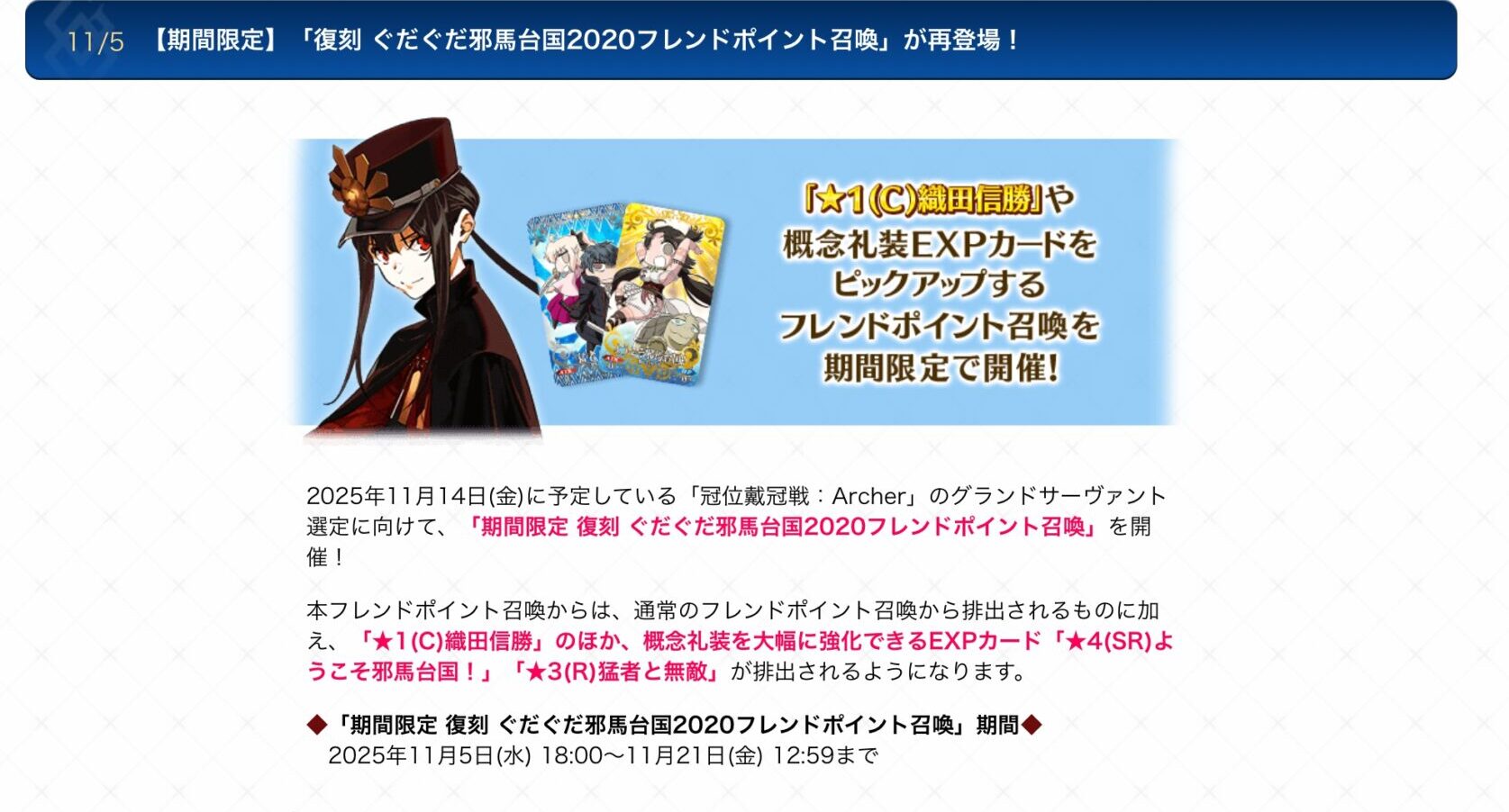 弓戴冠戦前という事で、信勝君が出てくるぐだぐだ邪馬台国2020フレポ召喚もこの度復刻