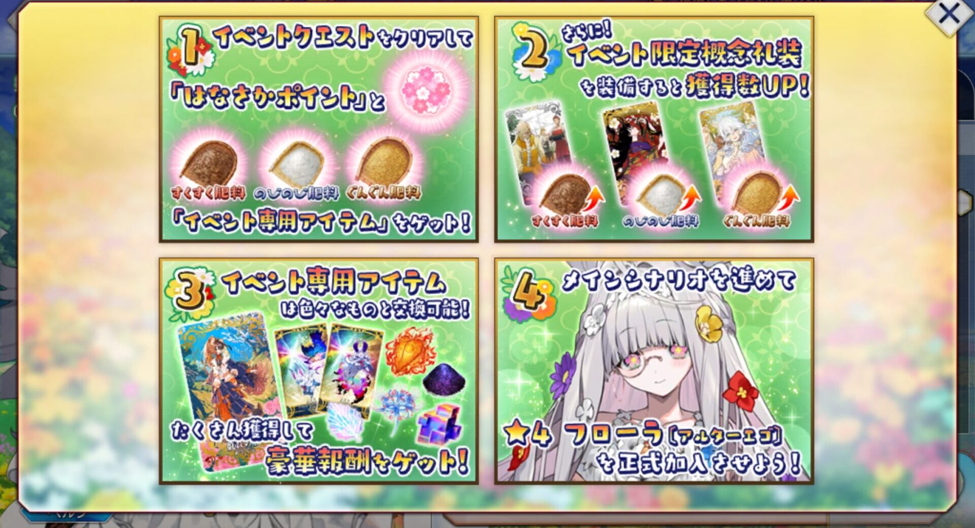 先週から告知されていた通り、花とか全然咲かない季節にも関わらず新規イベント「カルデアン・フロラリア~あなたの花が咲く頃に~」が開幕!