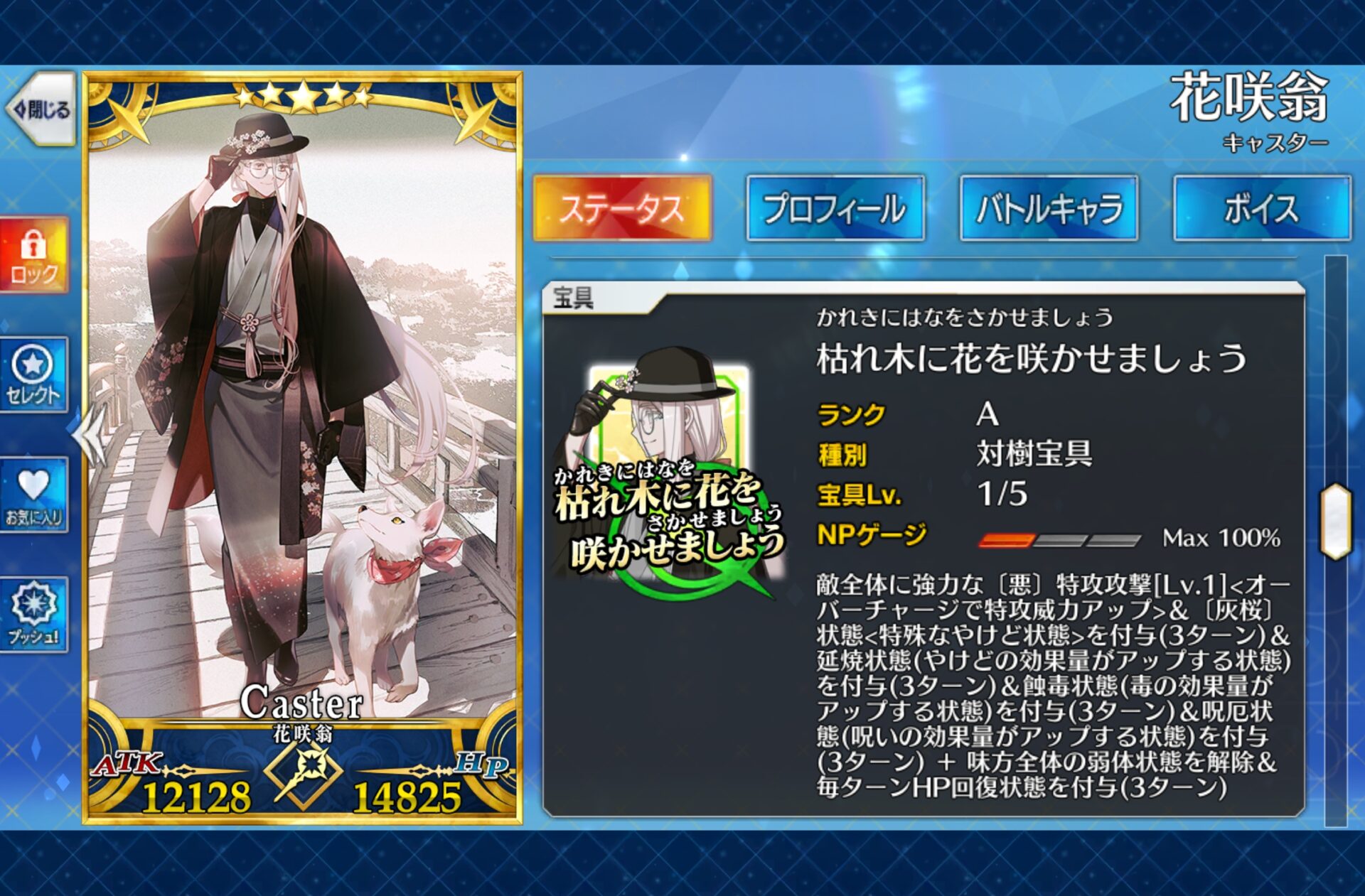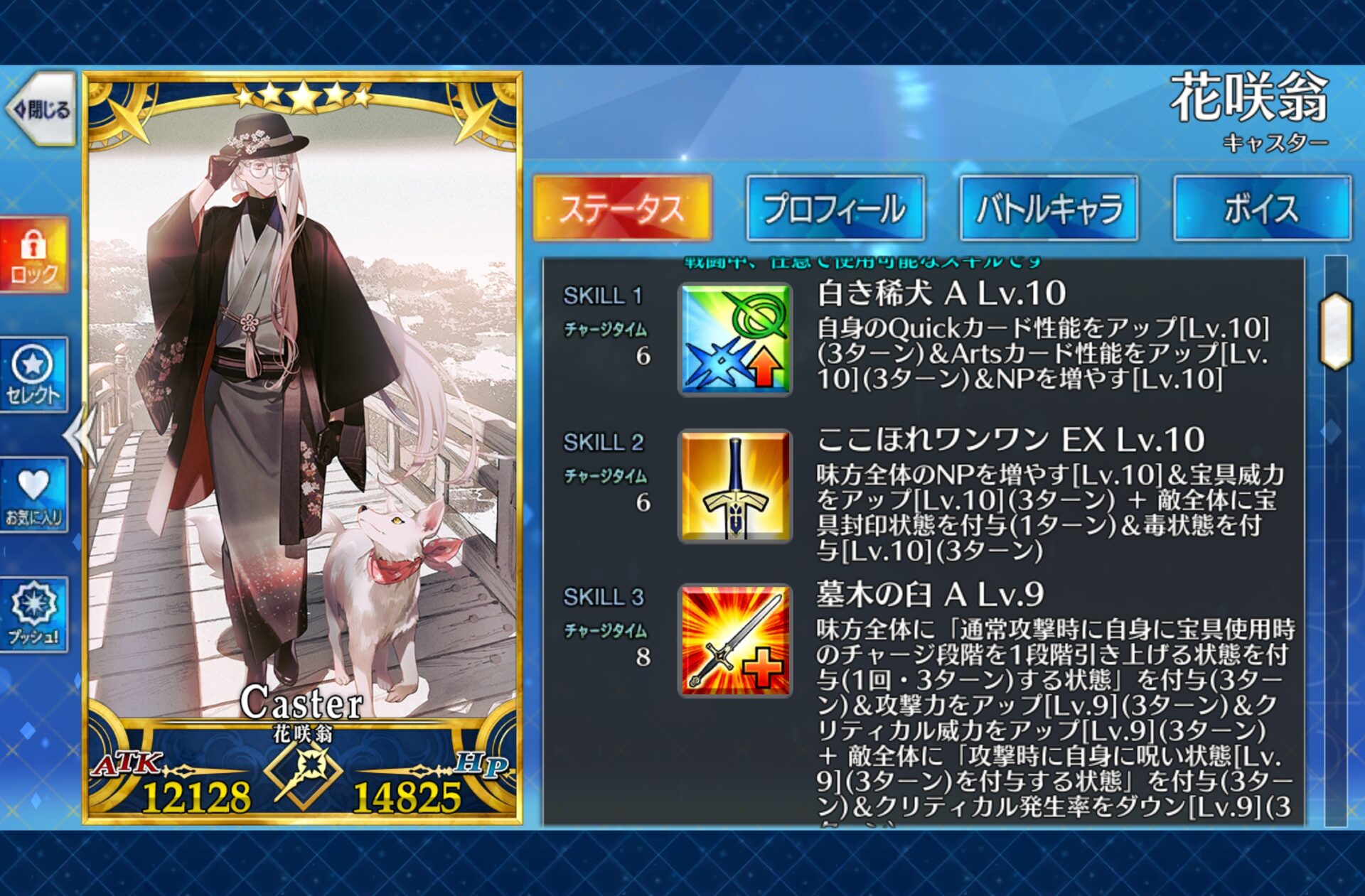 大人の都合?で、イケメンのボディーにおじいちゃんの魂をぶち込まれた状態の花咲じいさんは、味方全体にバフを撒きながら攻撃もできる、オールラウンダーなQ全体術鯖。ちなみに地属性且つ童話特性持ち。