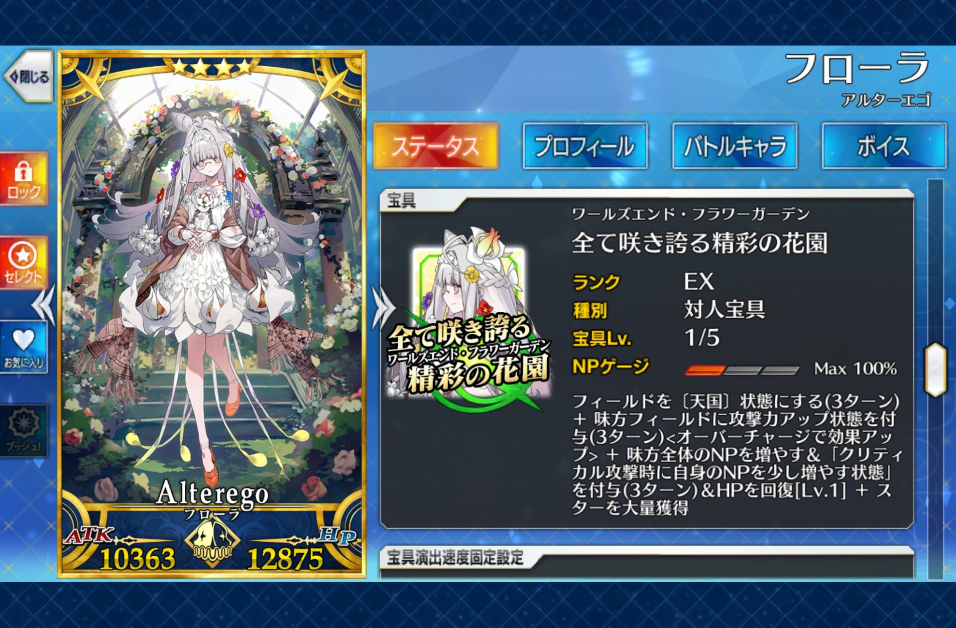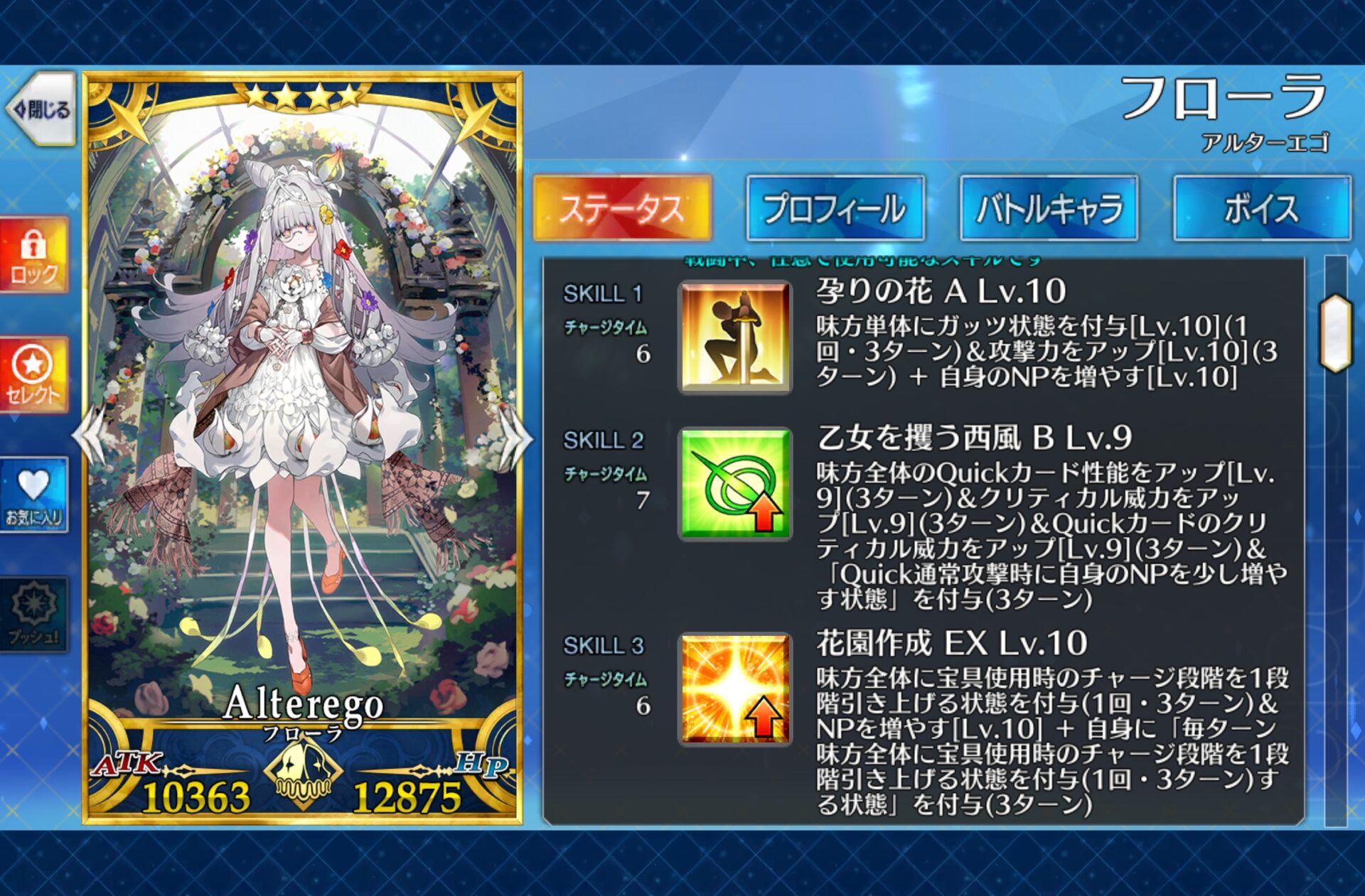 フローラのスキル及び宝具はこんな感じ。Q3枚+Q宝具というアサシン型のカード構成ながら、味方…特にQ鯖の補助に特化した、アルターエゴクラスのサポート鯖。