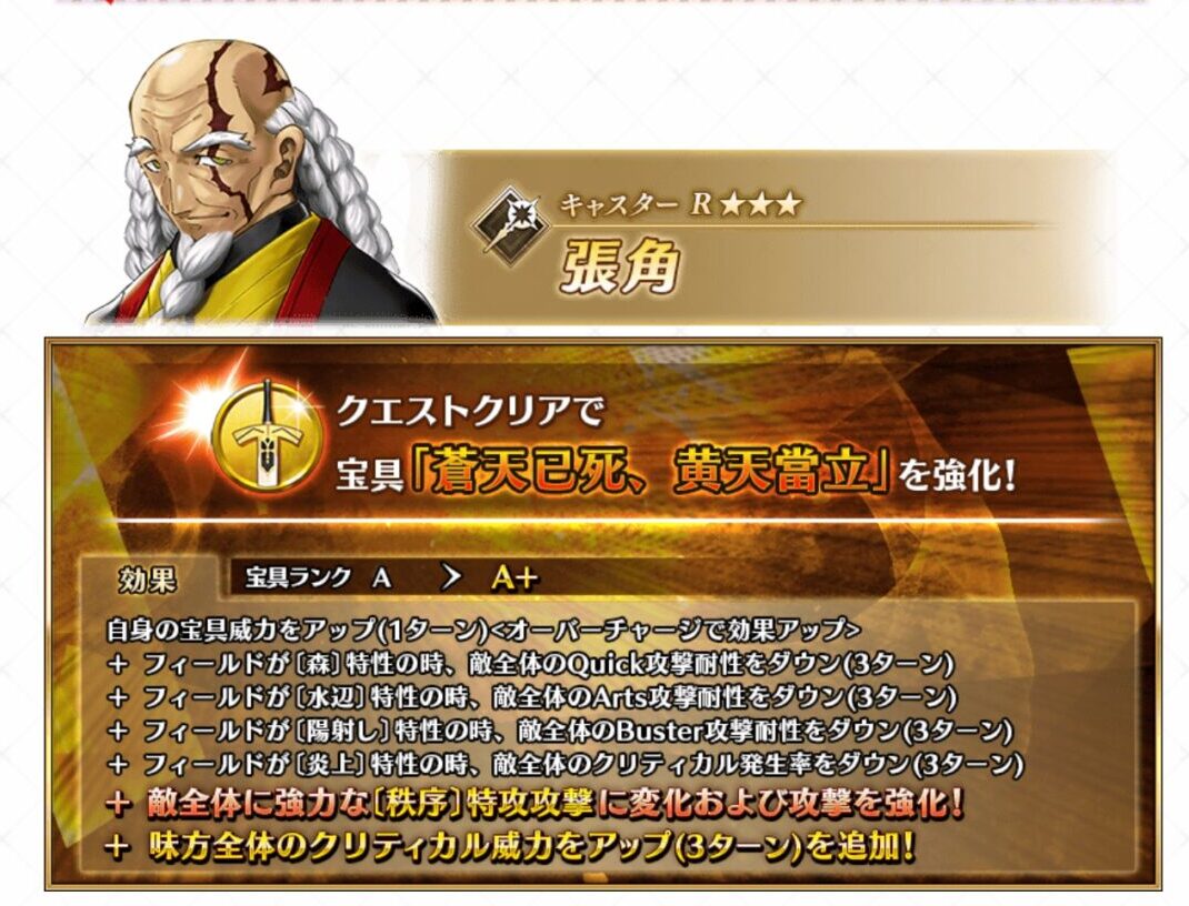 ピックアップ1で出現確率が上昇している張角には、なんとこのタイミングで宝具強化が実装。火力上昇+秩序特攻追加に加え、Q宝具らしく味方全体のクリティカル威力を強化できるように!