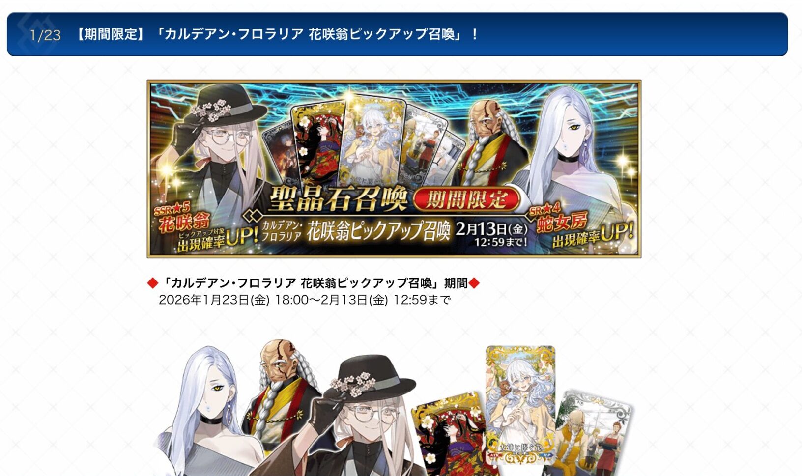 ピックアップ1では新規限定星5術の花咲翁、恒常星4殺の蛇女房が登場!