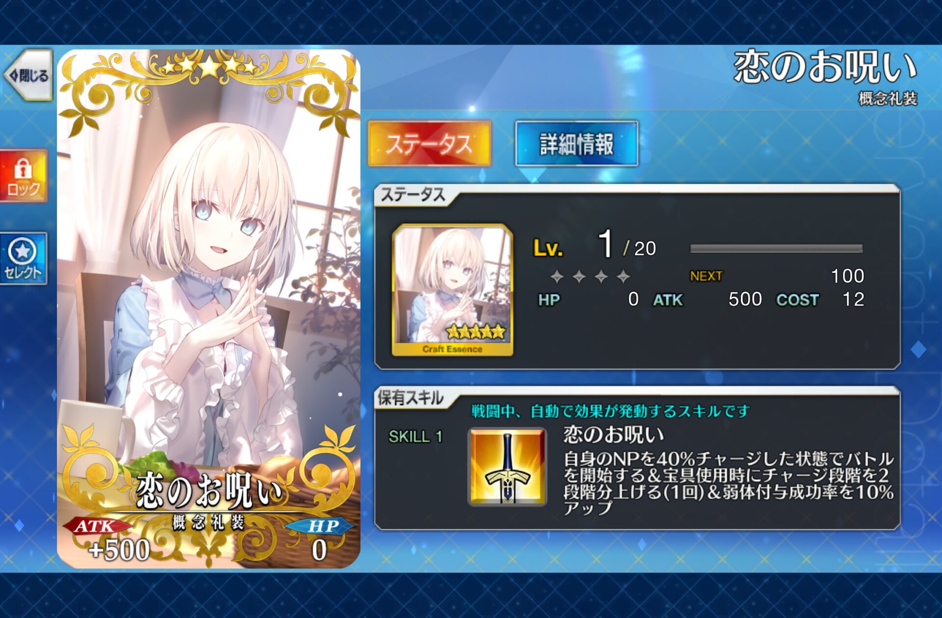 オダチェンと攻撃バフ、NPチャージ、星出しが全て両立している強力な礼装ですが、必要経験値は御愛嬌。