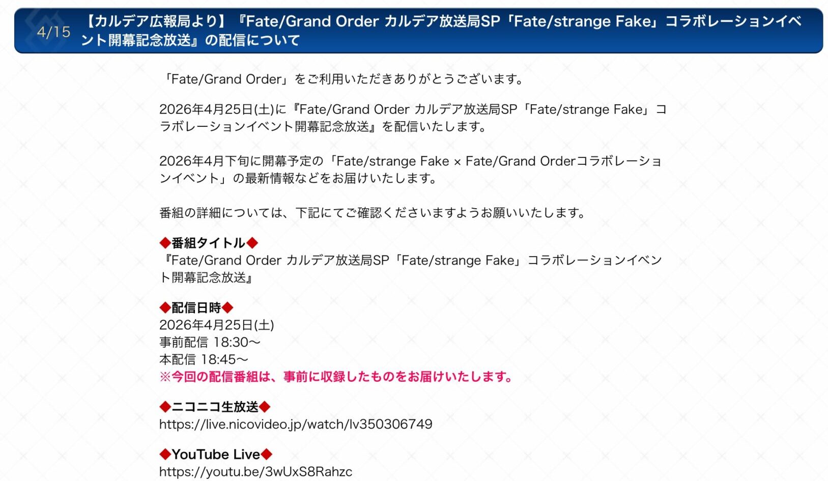 なんと今週土曜日にカルデア放送局をやる模様。大丈夫?休日出勤じゃない?